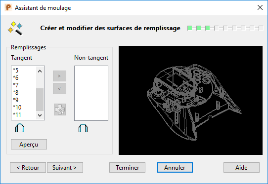 Terminer — Si vous sélectionnez cette option à ce moment là, vous allez quitter l'assistant de moulage, en gardant tout changement que vous avez effectué jusqu'ici.