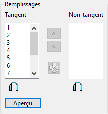 Les lignes de remplissage peuvent être déplacées entre les deux listes en utilisant les boutons de flèches. Quand une ligne de remplissage est déplacée dans une autre liste, elle est marquée d'un '*', ce qui signifie que sa surface de remplissage actuelle n'a pas encore été mise à jour.