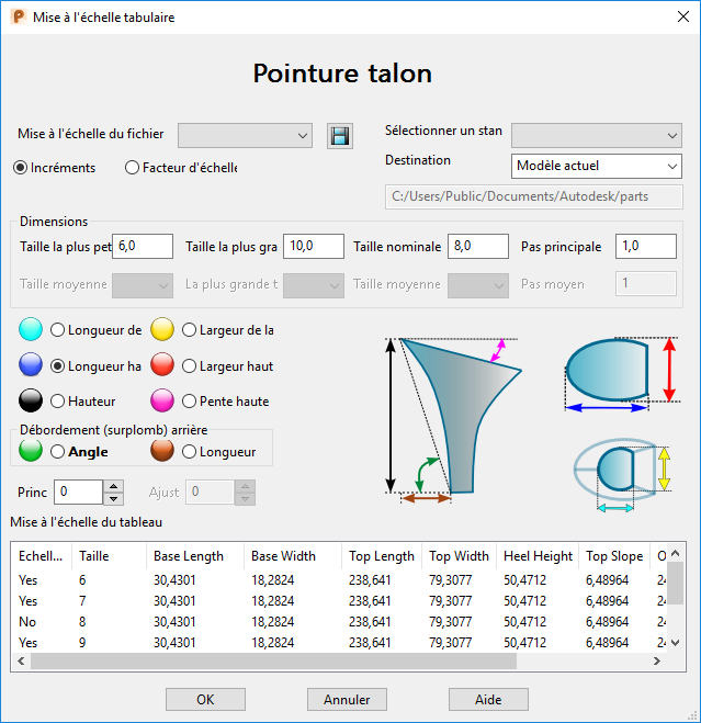 - Facteurs d'échelle pour spécifier l'incrément de pointurepar facteurs d'échelle par rapport à la taille nominale de la chaussure.