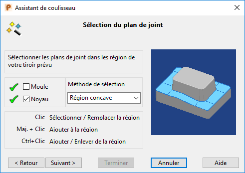 Utilisez cette page pour sélectionner le plan de joint sur l'empreinte de moulage pour les plaques de moule et de contre-moule.