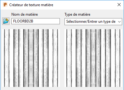 - Sélectionnez la texture que vous voulez. Vous pouvez utiliser n'importe quel fichier image comme base pour la nouvelle texture matière. L'image sélectionnée est affichée dans les deux fenêtres de la boite de dialogue Créateur de texture matière :