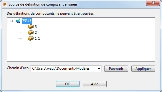Si le modèle actuel contient des définitions de composant importées et que le modèle source a été effacé ou renommé, la boite de dialogue Source de définition de composant erronée s'affiche :