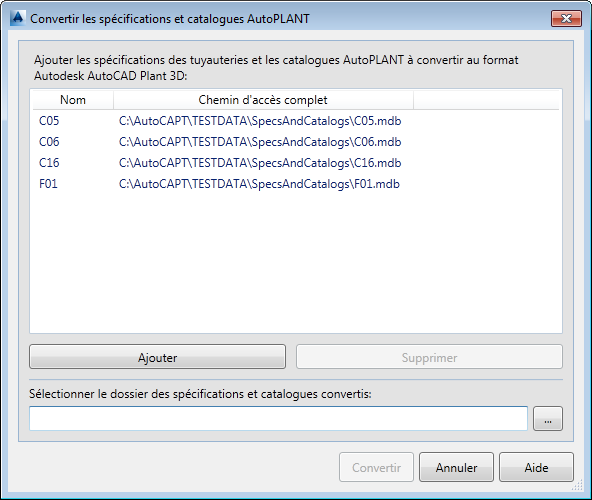Répertorie les spécifications ou catalogues AutoPLANT que vous ajoutez pour les convertir.