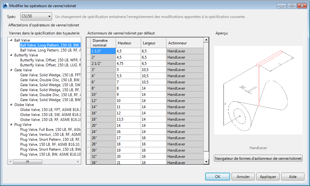 Affiche la boîte de dialogue Navigateur de formes d'actionneur de vanne/robinet.