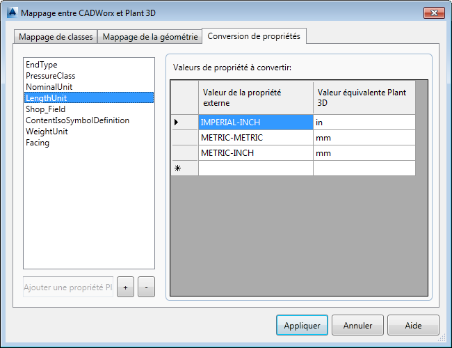 Convertit des valeurs de propriété CADWorx vers des équivalents Plant 3D.