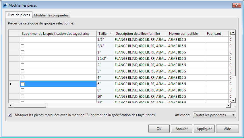 Si le diamètre nominal à ajouter n'apparaît pas lorsque vous désélectionnez Masquer les pièces marquées avec la mention "Supprimer de la spécification des tuyauteries", vous pouvez utiliser l'éditeur de catalogue pour ajouter le diamètre nominal.