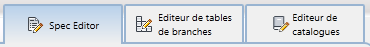Les onglets Editeur permettent de basculer entre les deux éditeurs. Utilisez l'onglet Spec Editor et l'onglet Editeur de tables de branches pour modifier des fichiers de spécification des tuyauteries. Utilisez l'onglet Editeur de catalogues pour modifier des catalogues.