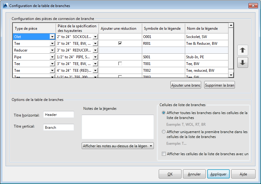 Définit les raccords utilisés dans la table de branches. Vous pouvez également définir des options d'affichage pour la table de branches.