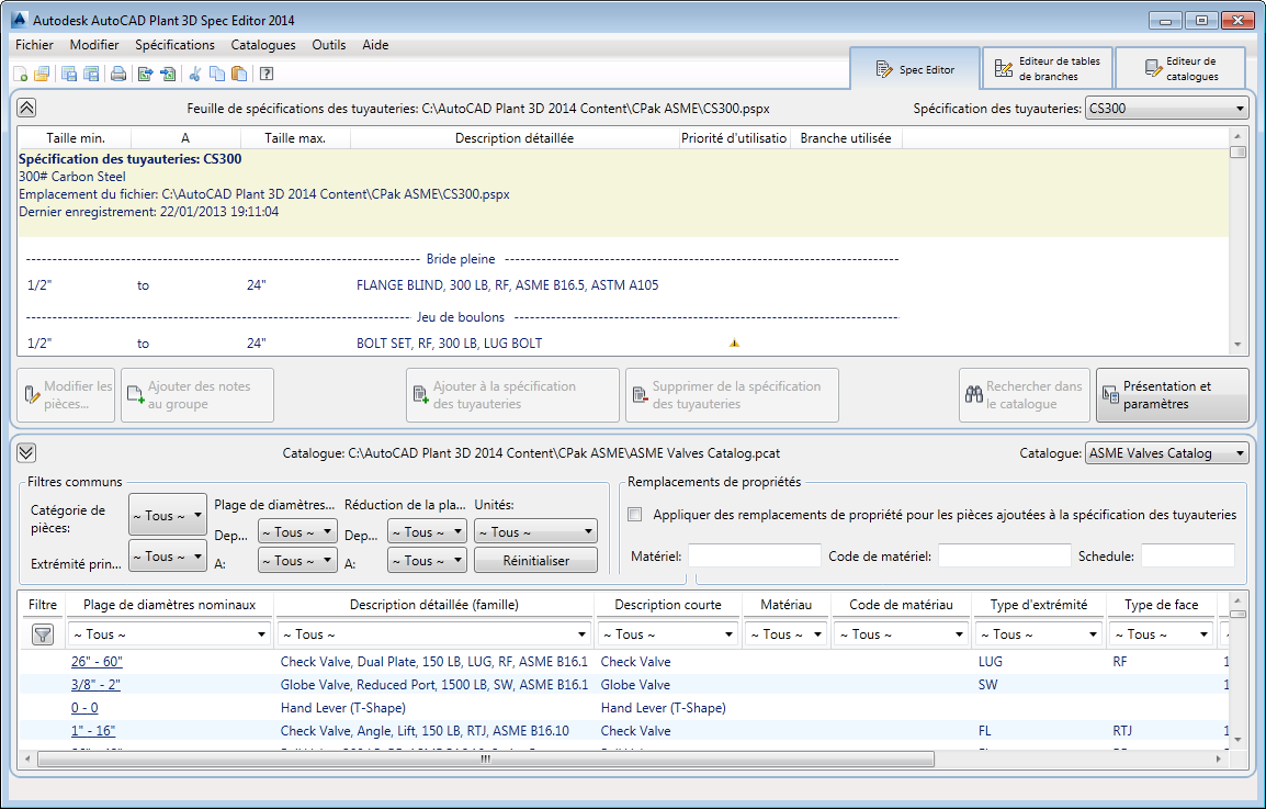 Lorsque vous ajoutez des pièces à la spécification des tuyauteries, tous les diamètres nominaux compris dans le groupe de pièces sont inclus. Vous pouvez utiliser la boîte de dialogue Modifier les pièces pour spécifier un intervalle de diamètres nominaux dans la spécification des tuyauteries.