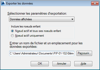 L'exportation inclut le noeud sélectionné et tous ses noeuds enfant.
