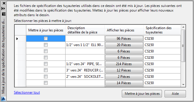 Met à jour les cotes des pièces sélectionnées.