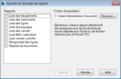 Le bouton Exporter ne s'active que lorsque vous sélectionnez un ou plusieurs types de rapport et avez spécifié un fichier d'exportation.