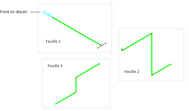 Le point de départ indique l'endroit où la ligne commence sur la feuille 1. Les points de coupure scindent les dessins isométriques en feuilles.