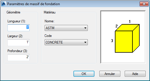 Définit les paramètres de géométrie par défaut des massif de fondations. Les valeurs numériques indiquées entre parenthèses correspondent à la géométrie identifiée dans l'image d'aperçu.