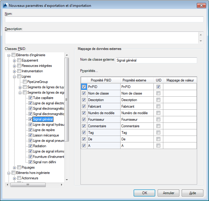 Modifie le nom, la description, les sélections et les mappages des objets et des propriétés P&ID.