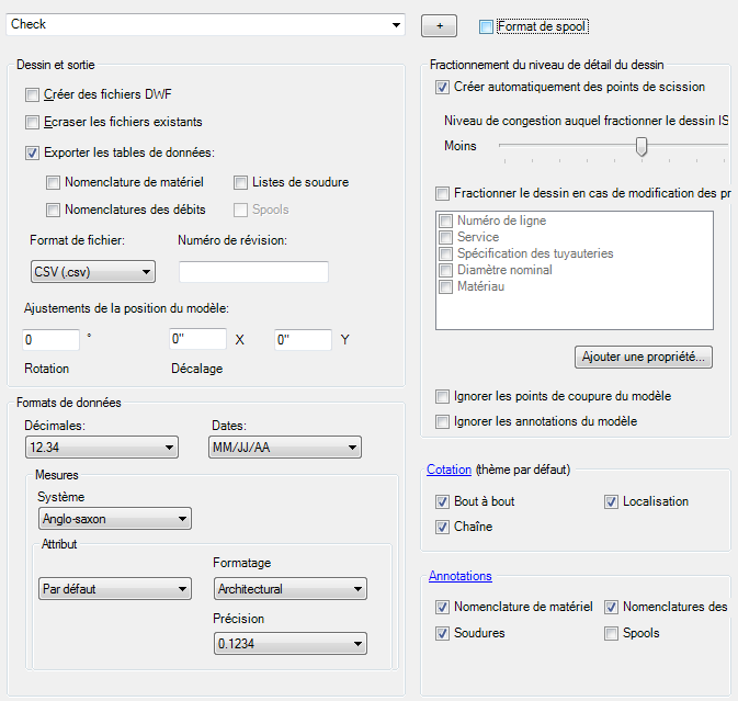 Définit le format et la précision du texte d'attribut, d'annotation et de nomenclature. Vous pouvez indiquer un autre format de tailles et de longueur de tuyau.