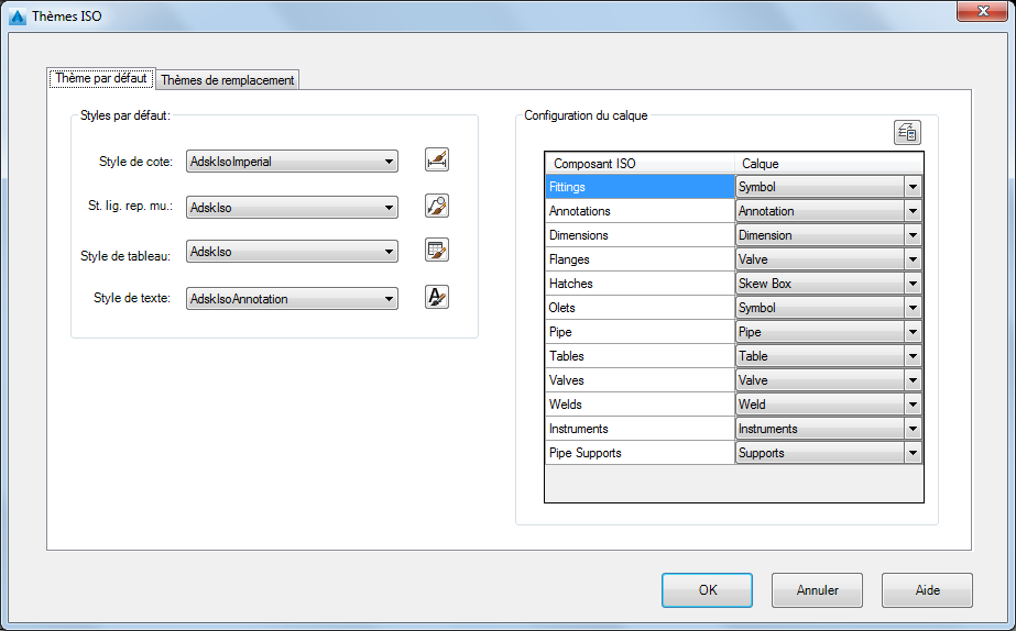 Dans la boîte de dialogue Thèmes Iso, onglet Défaut, effectuez les opérations suivantes :
