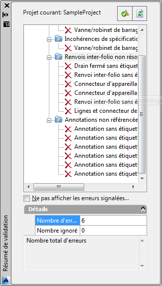 Affiche les erreurs de validation du dessin, que vous pouvez corriger ou ignorer.