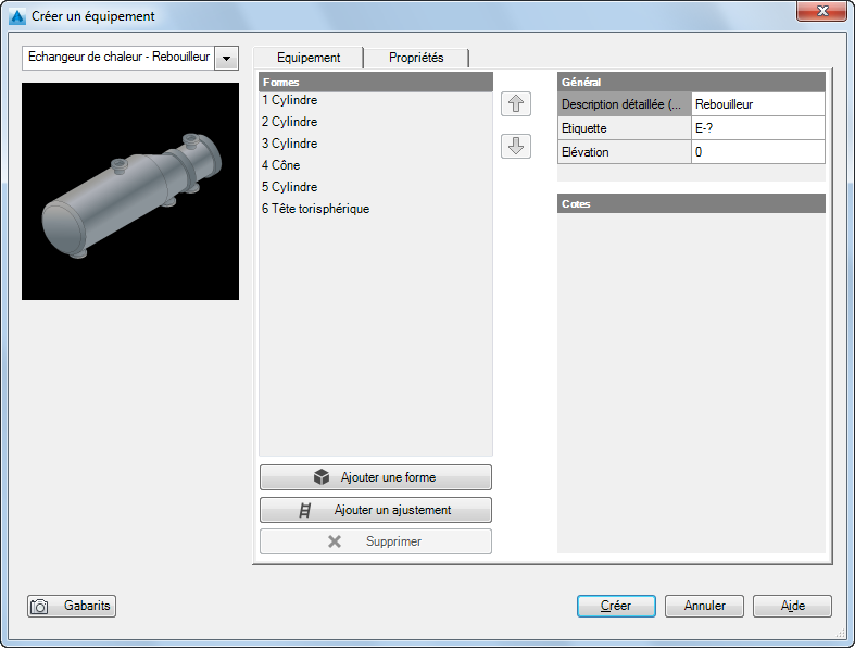 Pour certains types d'équipements, affiche la liste des formes que vous pouvez empiler pour créer un équipement. Vous pouvez également ajouter des formes pour créer un équipement personnalisé.