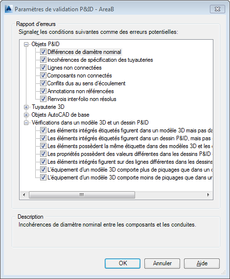 - Indique quels types d'incohérences entre le modèle 3D et le dessin P&ID sont signalés. Les options suivantes sont disponibles :