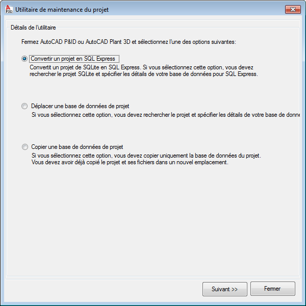 Cliquez sur Suivant pour afficher la boîte de dialogue Utilitaire de maintenance du projet - Convertir un projet vers SQL Express.