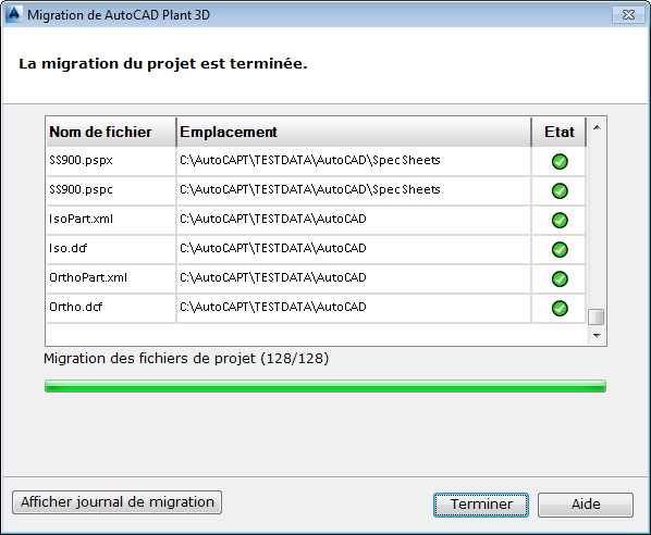 La migration peut prendre du temps, selon la taille du projet et le nombre de dessins associés. Le tableau de progression de la migration rend compte de la réussite ou de l'échec de la migration des fichiers et indique la progression de la migration. Une fois tous les fichiers migrés, le projet s'ouvre dans AutoCAD Plant 3D toolset.