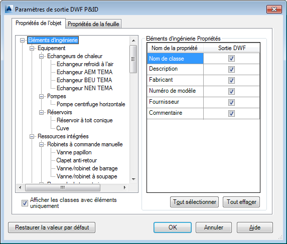 - Dans l'onglet Propriétés de la boîte de dialogue Paramètres de sortie, activez la case à cocher Afficher les classes avec éléments uniquement.