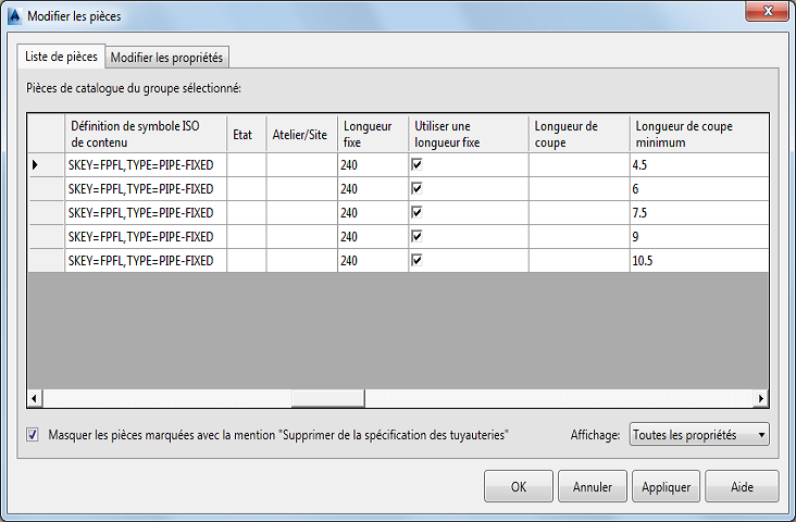 Vous pouvez également définir ces valeurs dans le catalogue et créer ou mettre à jour la spécification des tuyauteries.
