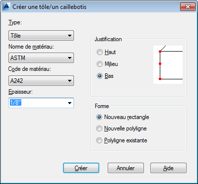 Spécifie la forme de la tôle ou du caillebotis. Les options sont Nouveau rectangle, Nouvelle polyligne et Polyligne existante.