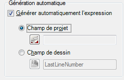 - Dans la zone Génération automatique, activez la case à cocher Générer automatiquement l'expression. Cliquez sur Project Field (ou Drawing Field) en fonction de vos besoins.