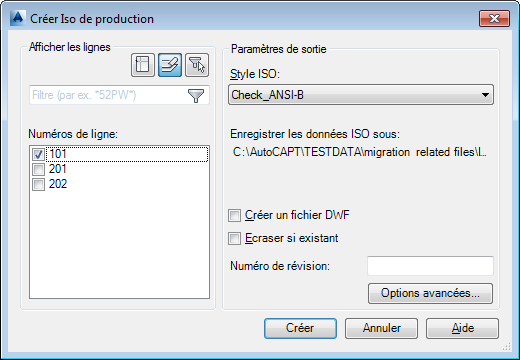 Générer un dessin isométrique de production Spécifie le type Iso, les options de remplacement et le fichier de sortie DWF.