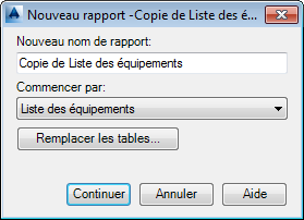 4. Dans la boîte de dialogue Nouveau rapport, entrez le nom du nouveau rapport (p. ex. Nouvelle luste d'équipements).