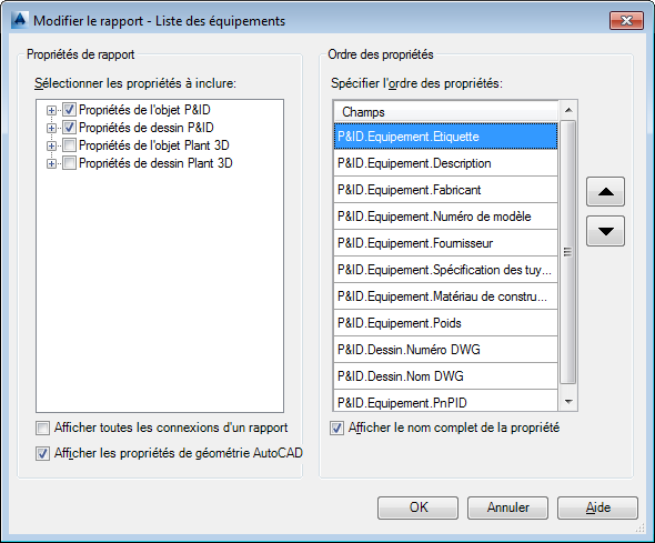 Si vous créez un gabarit de rapport Plant 3D, vous pouvez spécifier des propriétés d'objet ou de dessin Plant 3D ou les trier de la façon appropriée. Les données Plant 3D ne sont incluses dans le rapport que si un objet P&ID correspondant avec la même étiquette existe dans le projet.