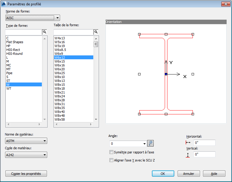 Dans la liste Norme de matériau, choisissez la norme de matériau à utiliser pour les nouveaux profilés.
