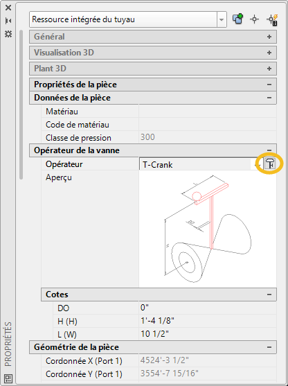 Dans la palette des propriétés, cliquez sur Plant 3D Propriétés de la pièce Actionneur de vanne/robinet.