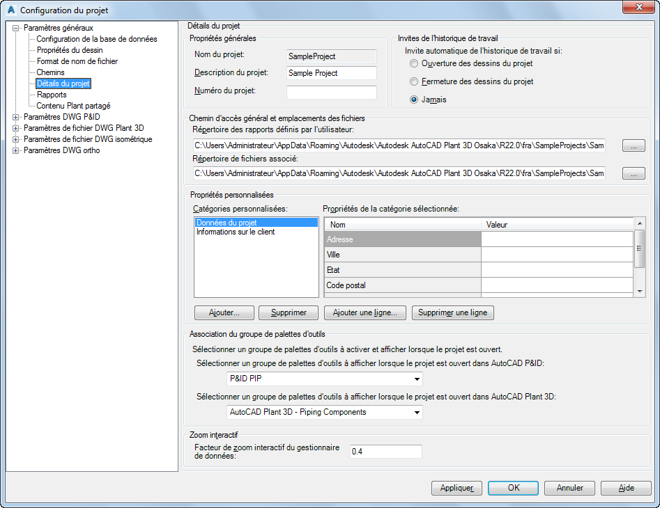 Définit les catégories du projet. Les catégories Données du projet et Informations sur le client sont complétées par défaut.