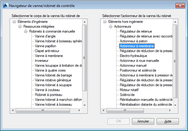 Sélectionne un corps de vanne/robinet de contrôle et un actionneur pour une vanne/un robinet de contrôle que vous placez dans un dessin.