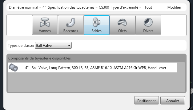 Spécifie le composant à placer. Affiche la liste des composants de tuyauterie correspondant à la spécification des tuyauteries, au diamètre nominal, au type d'extrémité et à la classe courants.
