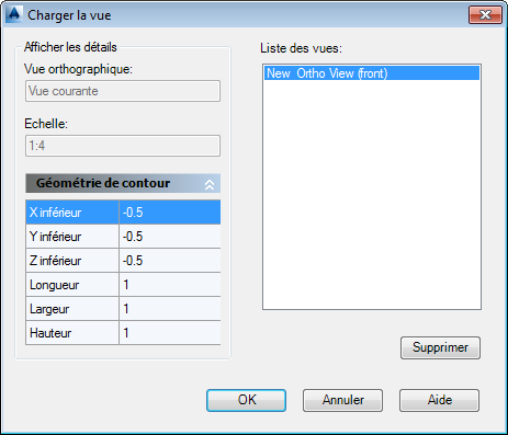 Affiche la liste des vues orthographiques enregistrées que vous pouvez charger dans le dessin temporaire. En cliquant deux fois sur le nom d'une liste, vous pouvez la renommer.