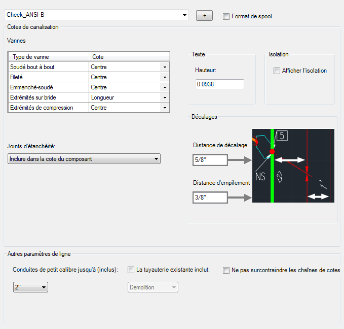 Répertorie les types de vannes/robinets pour lesquels vous pouvez spécifier un style de cote. Pour chaque type de vanne/robinet, vous pouvez spécifier Longueur globale et Centre.