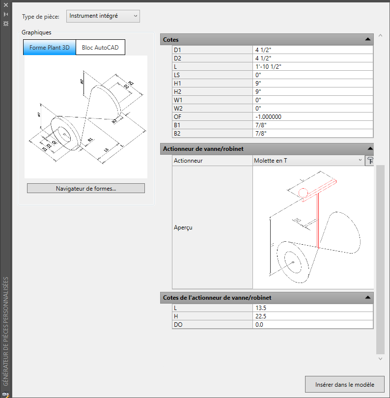 Lorsque l'option Vanne est sélectionnée en tant que type de pièce, la section Actionneur de vanne/robinet s'affiche avec un aperçu de la vanne. Cliquez sur l'image pour obtenir une version agrandrie de l'aperçu. En outre, la section Cotes s'affiche avec des cotes modifiables pour chaque type sélectionné. Par exemple, la section Cotes de l'actionneur de vanne/robinet affiche les informations suivantes :