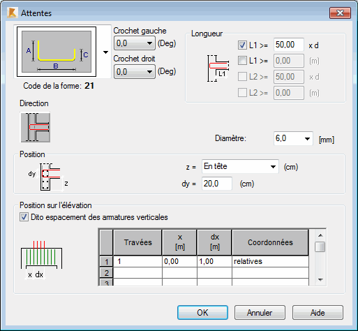 - Position l'élévation - fait référence à disposition de l'armature le long de la travée ; si l'option Dito espacement des armatures verticales est sélectionnée, il est alors nécessaire de spécifier la distance entre le début de la zone de l'armature d'attente et l'appui, ainsi que la largeur de l'appui. Si l’espacement nécessaire est différent de celui pour les armatures verticales, il faut en plus déterminer le nombre d’attentes.