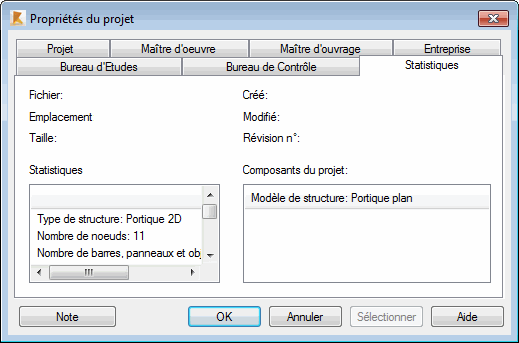 Sélectionnez Fichier > Propriétés du projet, puis choisissez l’onglet Statistiques pour afficher les statistiques du projet. Ces informations comprennent le nom du fichier, son emplacement et sa taille, ses dates de création et de modification, ainsi que le numéro de révision. Les statistiques et les composants du projet sont également indiqués dans cet onglet.