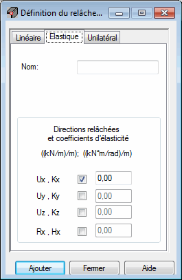 Les coefficients d'élasticité sont disponibles uniquement lorsque les options de relâchement élastique et de relâchement unilatéral sont sélectionnées. Les valeurs du coefficient d’élasticité pour les relâchements linéaires sont données dans les unités suivantes :