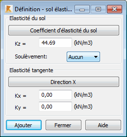 Dans la boîte de dialogue Définition -Elasticité du sol, vous pouvez définir la valeur du coefficient KZ (coefficient d'appui élastique) :