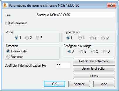 Les paramètres de l’analyse sismique des structures dépendent de la norme parasismique sélectionnée pour le calcul des structures sollicitées par des charges sismiques. Sélectionnez la norme chilienne dans la boîte de dialogue Définir un nouveau cas ou cliquez sur le bouton Paramètres dans la boîte de dialogue Type d’analyse.