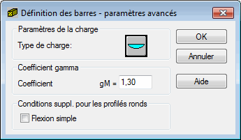 Utilisez cette option pour définir des paramètres supplémentaires : type de charge d'un élément de structure en bois et coefficient de matériau. On y accède en cliquant sur le bouton Plus de la boîte de dialogue Définition des barres - paramètres. Le logiciel affiche la boîte de dialogue ci-dessous :