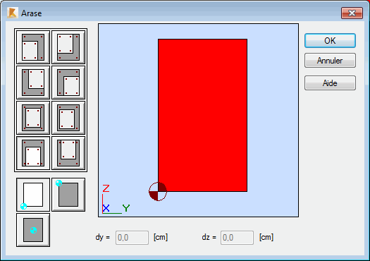 Après la sélection du segment et un clic sur le bouton Arase, le logiciel affiche la boîte de dialogue auxiliaire Arase (voir la figure ci-dessous) dans laquelle vous pouvez établir la relation entre les segments voisins à l'aide des points caractéristiques des sections (par exemple, vous pouvez définir la colinéarité par rapport à l'angle droit en haut de la section). De plus, vous pouvez positionner les sections en saisissant les déplacements des segments par rapport à dy et dz. Dans un tel cas, vous pouvez définir un point de repère par rapport auquel les sections seront positionnées de façon arbitraire. Le segment peut être positionné dans deux directions : Y et Z. Les champs 'dy' et 'dz' affichent l'incrément de déplacement des points caractéristiques par rapport au point de référence. La modification de la position du point de repère entraîne le recalcul automatique des valeurs dy et dz. La section marquée est affichée en gris, la section voisine est affichée en jaune, le positionnement s'effectue par rapport au segment affiché en jaune.