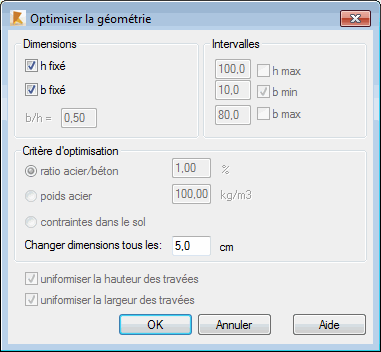Les options disponibles dans cette boîte de dialogue permettent d’optimiser la géométrie de la poutre ou d'une semelle filante en ce qui concerne la consommation d'acier moyenne par élément. Après un clic sur le bouton Optimiser la géométrie disponible dans la boîte de dialogue Options de calcul, la boîte de dialogue représentée sur la figure ci-dessous s’affiche.