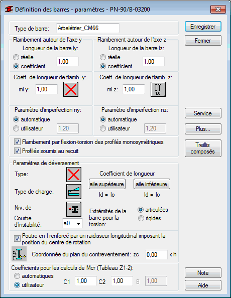 Au bas de la boîte de dialogue, des champs textuels permettent de définir les coefficients A1, A2, B (C1 et C2) pour le calcul du moment critique Mcr ; l'option permettant la sélection automatique de valeurs de ces coefficients est activée par défaut. La sélection de l’option Utilisateur permet de définir manuellement les coefficients définis dans le Tableau Z1-2.